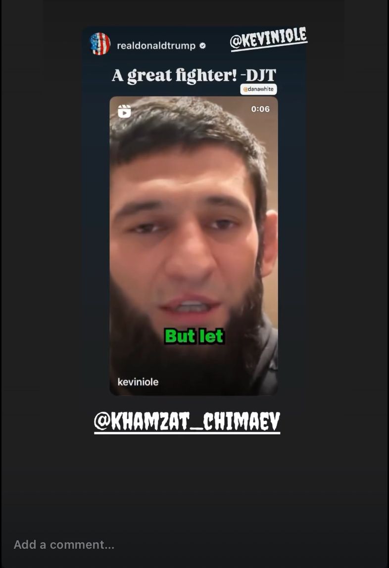 Remember, Chimaev told me in an interview in October that he figured he'd fight in the U.S. if Donald Trump were elected president. Trump was elected and will be inaugurated for his second term on Jan. 20. Trump shared my Instagram reel of Chimaev making that comment on his Instagram story, so it seems the President-elect is on board, too.